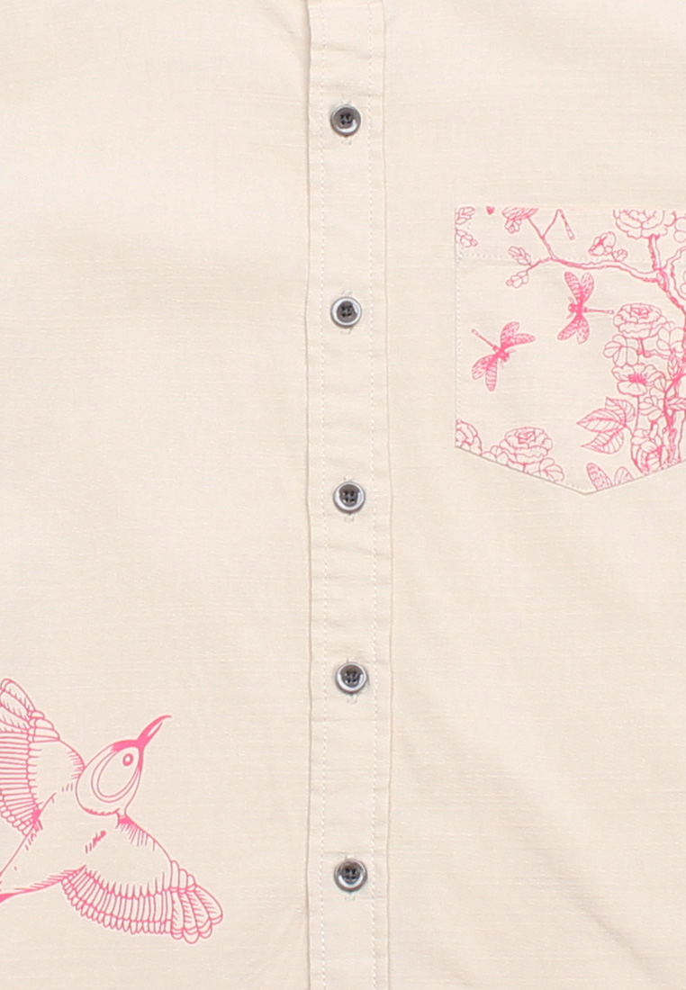 - 100% Brushed cotton twill mandarin collar short sleeve shirt with Chinoiserie print on pocket and side.