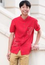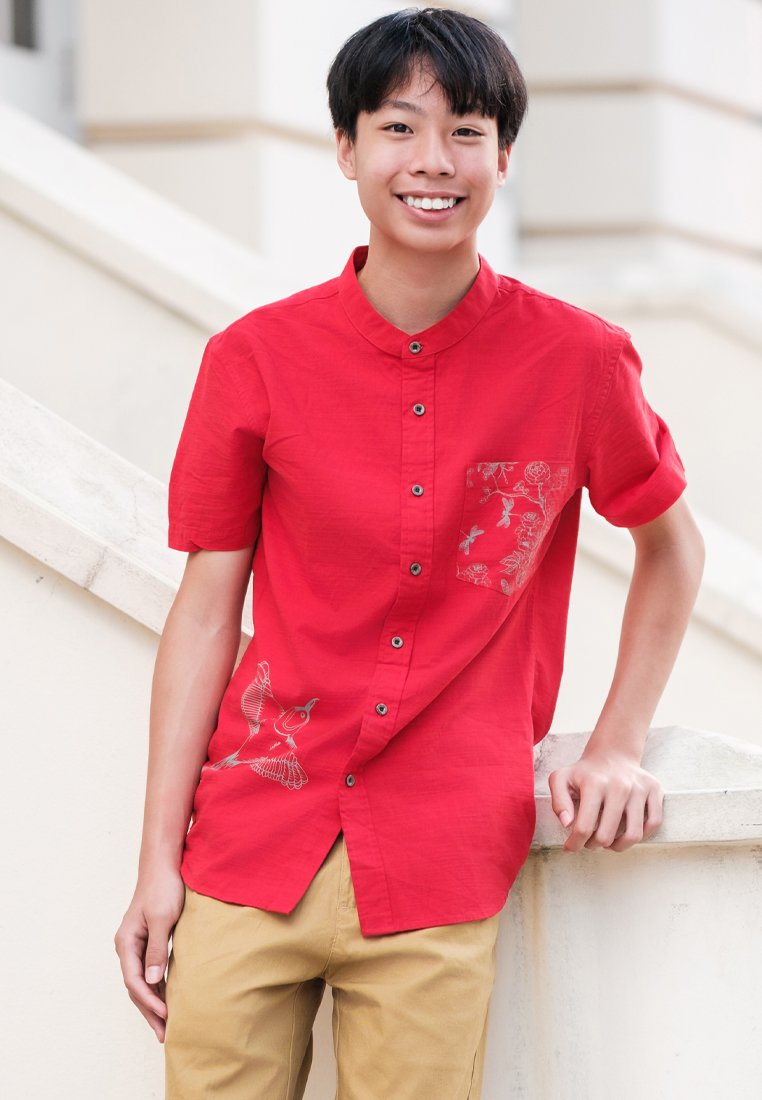 Chinoiserie Prints Mandarin Collar Short Sleeve Boy's Shirt RED
