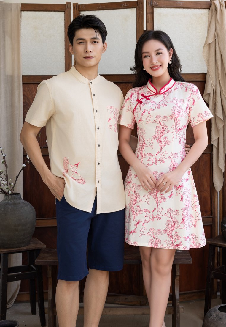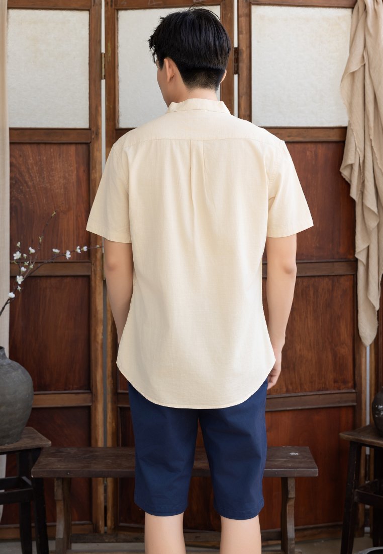Chinoiserie Prints Mandarin Collar Short Sleeve Men's Shirt CREAM