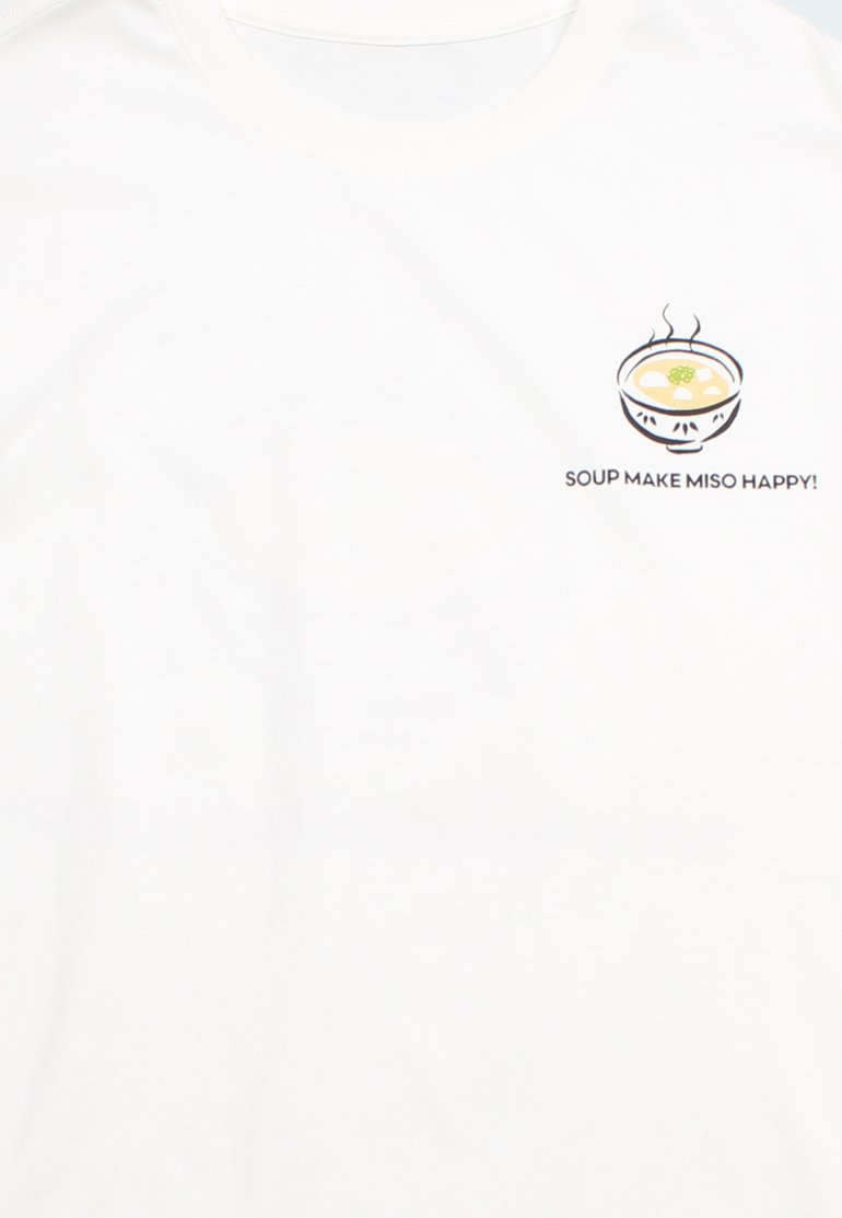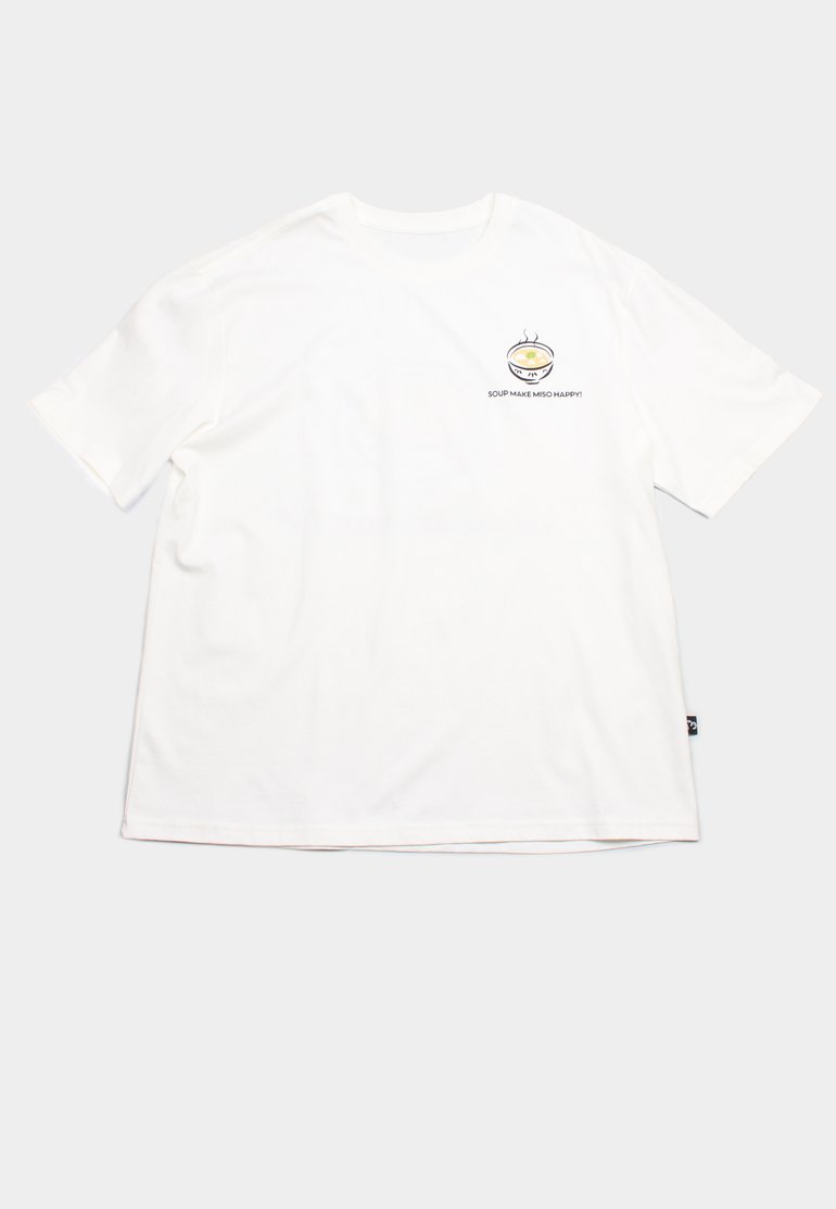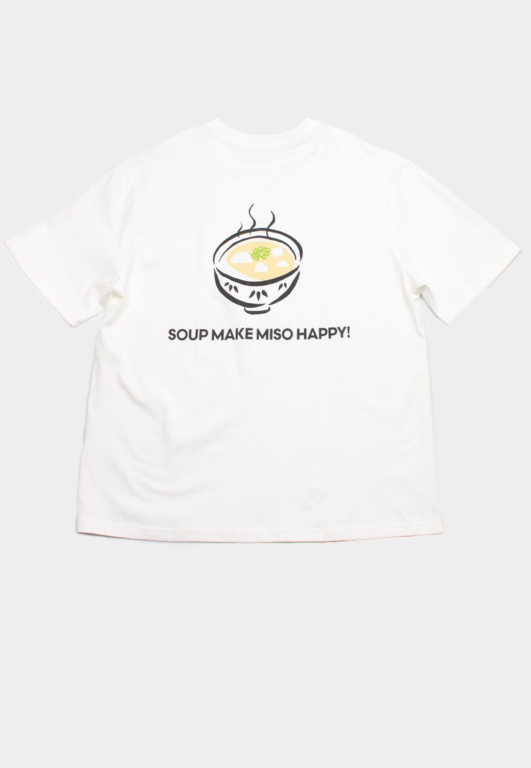 - 100% premium cotton white oversized streetwear t-shirt with "SOUP MAKE MISO HAPPY!" printing on front and back.