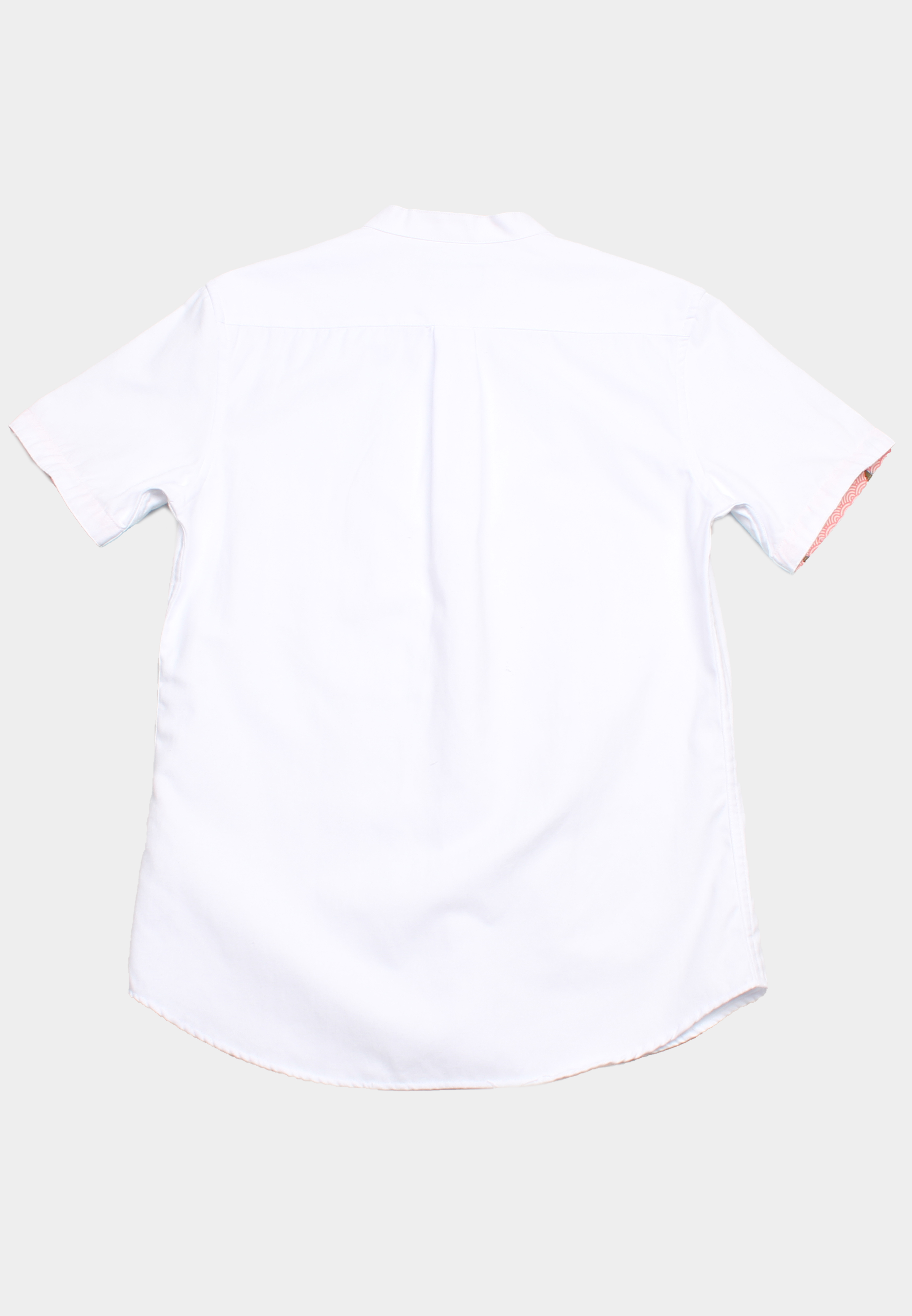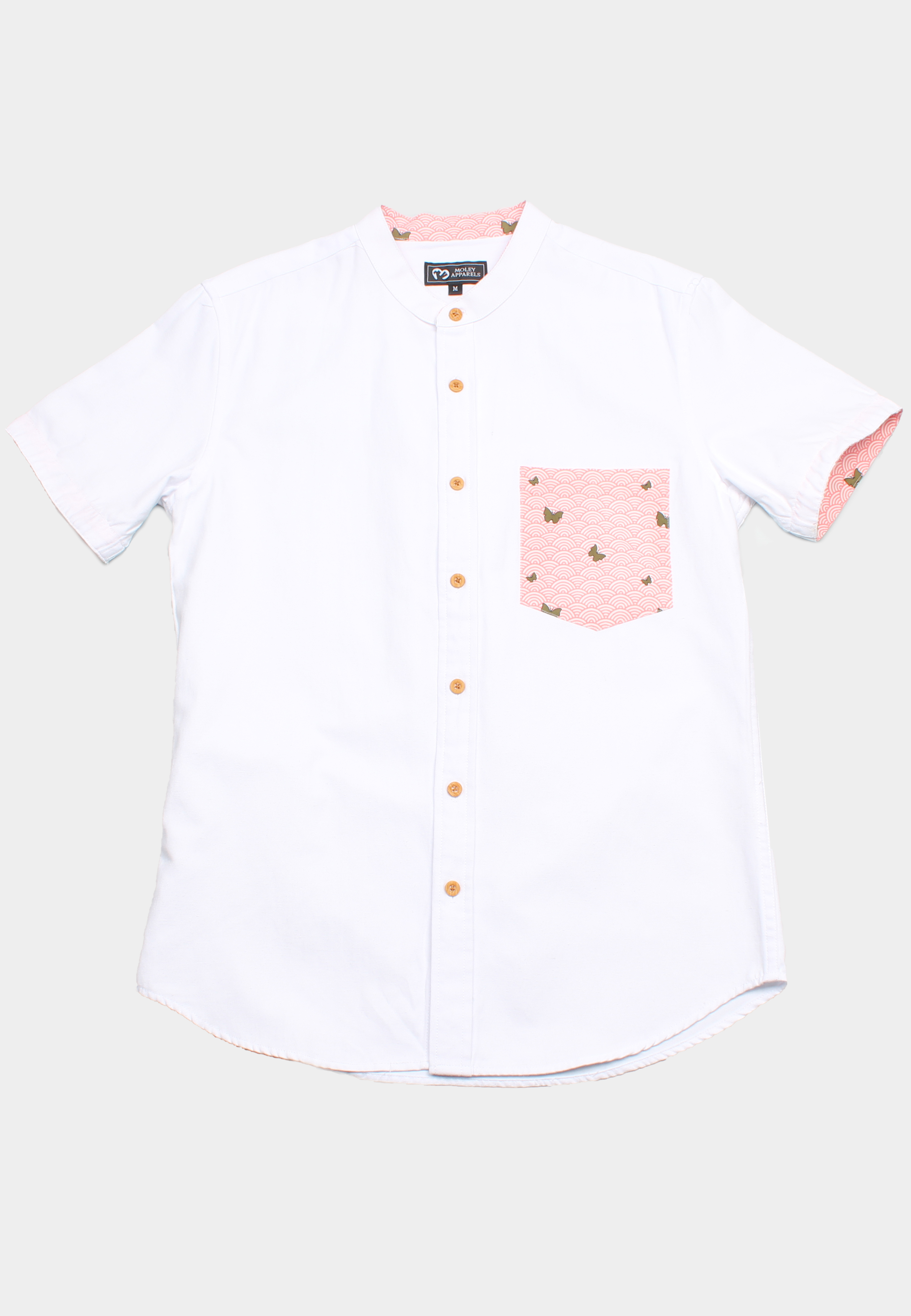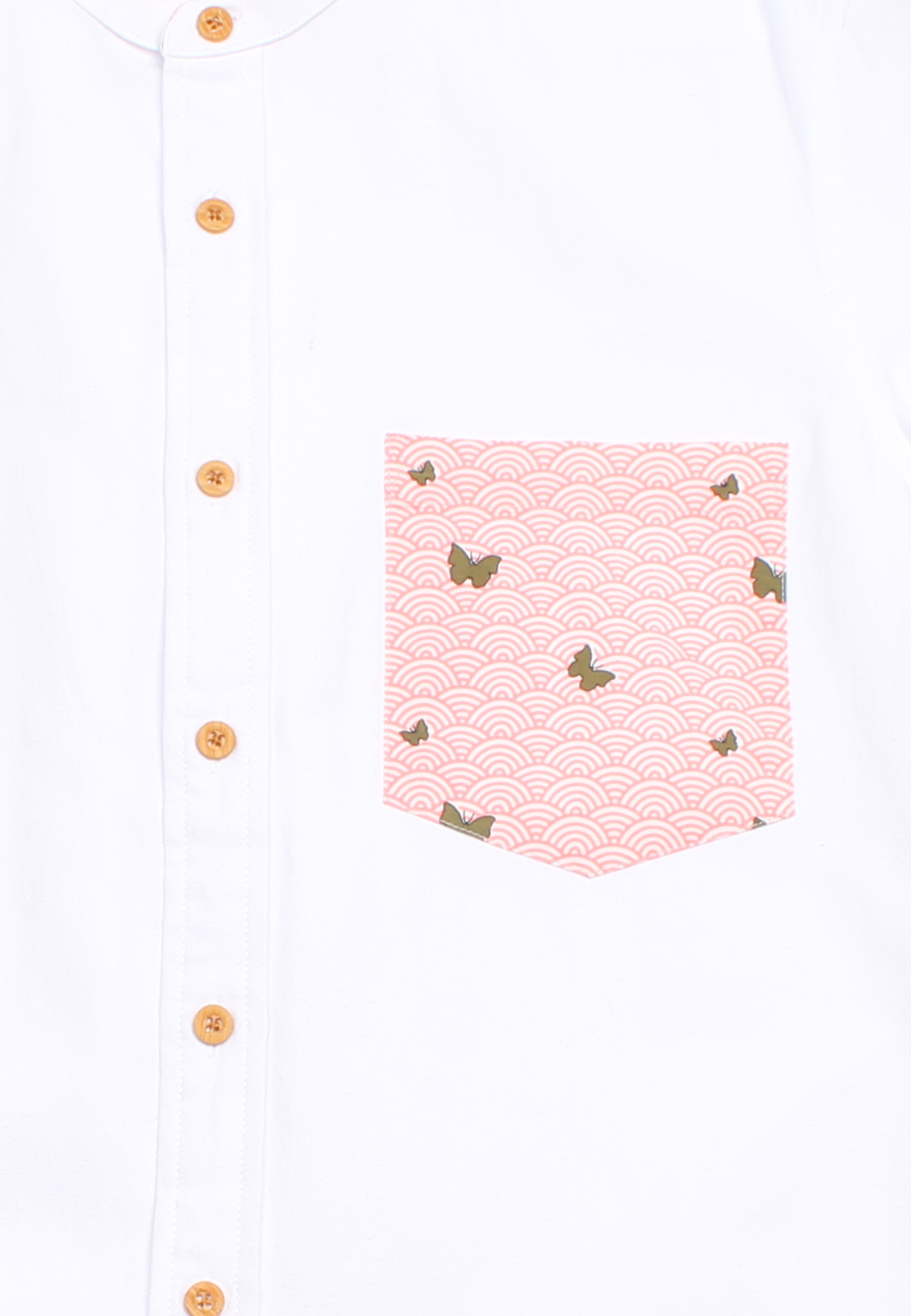 - 100% Brushed cotton twill mandarin collar short sleeve shirt with oriental butterfly print on pocket.