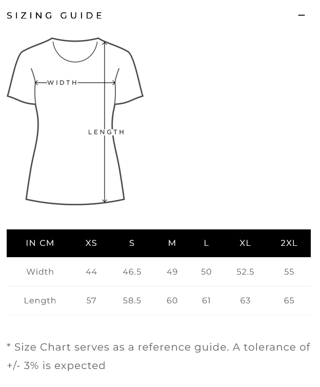 * Size Chart serves as a reference guide. A tolerance of +/- 3% is expected